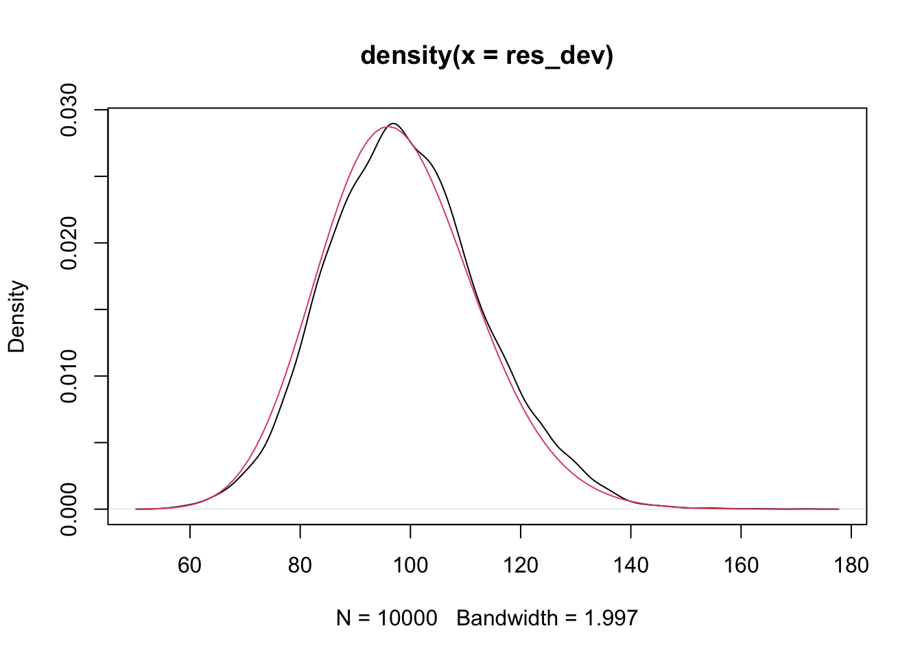 This indicates that the negative binomial model without zero inflation seems to be doing an OK job modeling the number of zeros in the data set. Just as a test, let’s add a bunch of structural zeros and see whether it then fails this test.