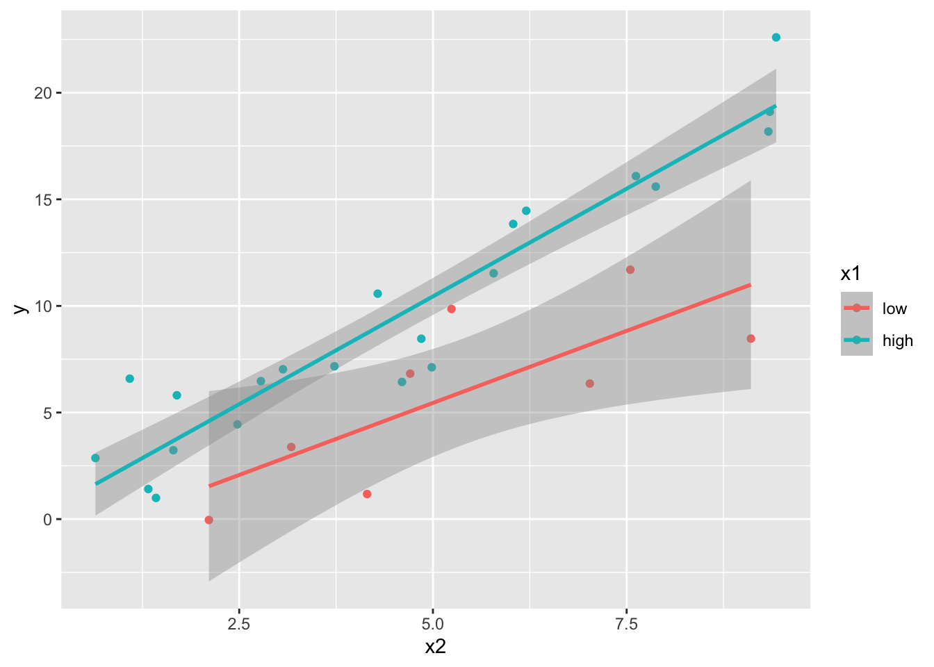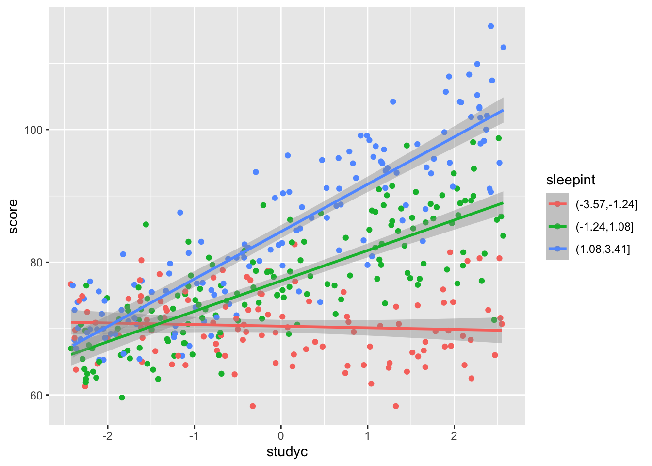 numeric vs numeric In this case, the effect of changing a numerical predictor by one unit (the slope) depends on the exact value of a different numeric variable. The model for this is \[ y ~ \beta_0 + \beta_1 x_1 + \beta_2 x_2 + \beta_3 x1 x_2 + \epsilon \] So that the change in slope of \(x_1\) depends in a very specific way on the value of the interaction variable \(x_2\). As an example, we model exam score by hours of sleep (before studying) and hours of studying. It is reasonable to expect that the more sleep you get, the more effective each hour of studying will be. Here is a sample chart of values: