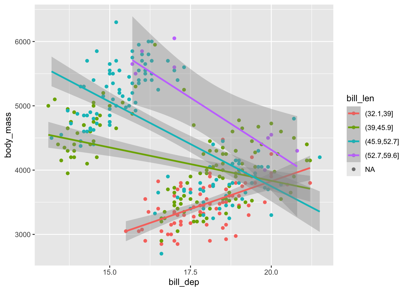 R-Code Let’s look at how this works using R. We start by showing how to simulate data of each of the above types of interactions. There are two R functions that you might not be familiar with that we will use: case_when and pivot_wider. The function case_when is a way of encoding piecewise defined functions. For example, if you have