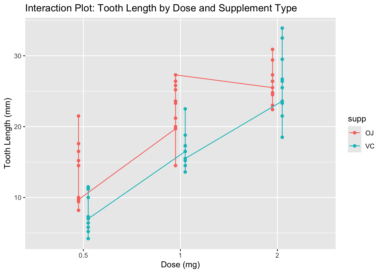 factor vs factor interaction Two factors interact when the effect of changing levels in one of the factors depends on which level the other factor has. As a made up example, suppose students are randomly assigned to study flashcards or to do practice problems in preparation for an exam. The students self-identify as having low prior knowledge or high prior knowledge before starting to study. Here is a chart giving mean scores on exam for the four groups of students.