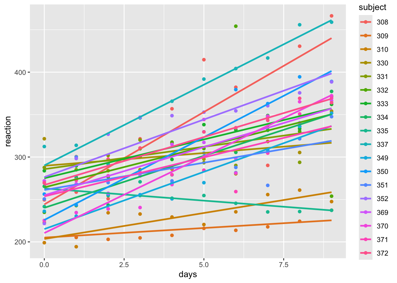 mod_sleep <- lmer(reaction ~ days + (1 + days || subject), data = ss) #assuming uncorrelated random effects