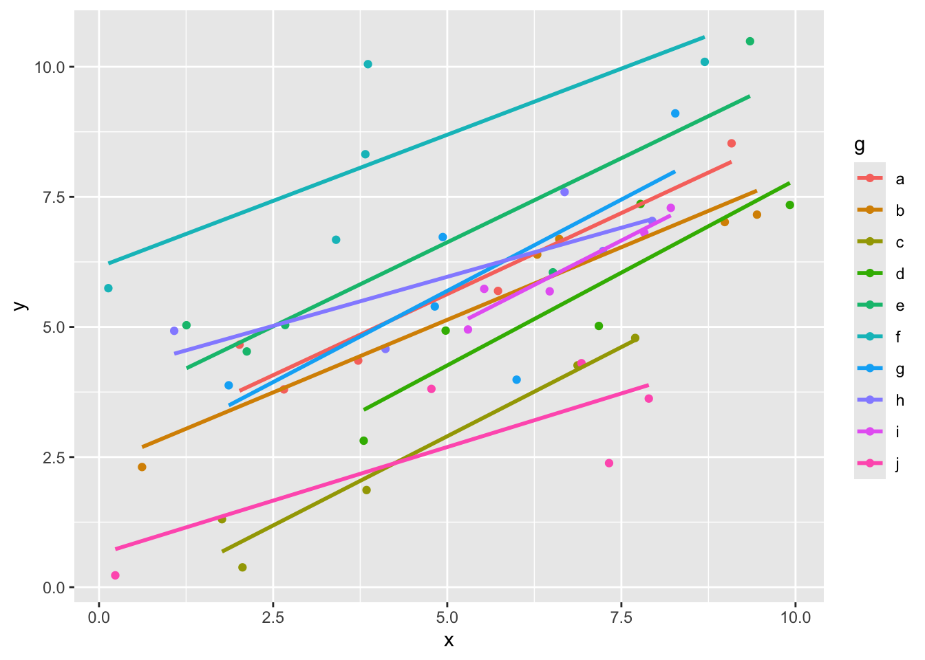 mod <- lmer(y ~ x + (1 + x||g), data = dd) #We use || to force there to be no covariance between beta_0 and beta_1