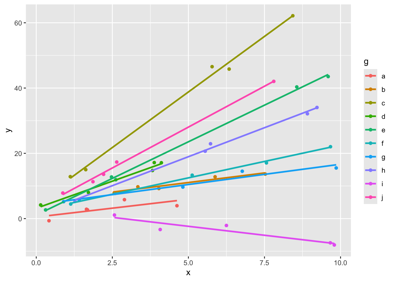 y <- beta0 + beta1 * x + rep(b0, each = n) + rep(b1, each = n) * x + rnorm(g * n, 0, sigma) #these are the responses, note that sigma^2 = 1, beta_0 = 3, and beta_1 = 0.5